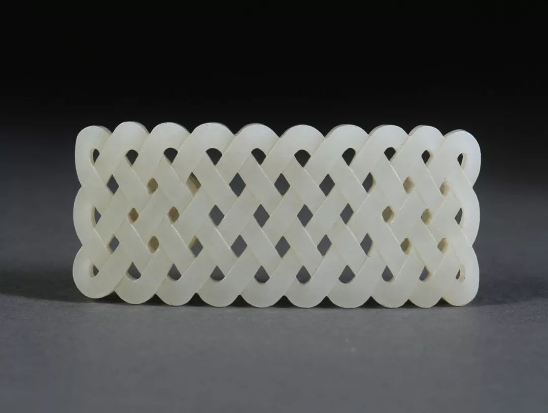 该带钩玉质细腻洁白,采用透雕形式雕刻出疏密均匀的绳结纹,风格简约,棱角圆润,极为罕见。类似作品参见苏富比香港,2014年5月27日,拍品800号,清十九世纪白玉双蝠盘长带钩;佳士得伦敦南肯星顿,2010年11月12日,拍品5528,清18世纪白玉带钩。来源80年代购于日本。