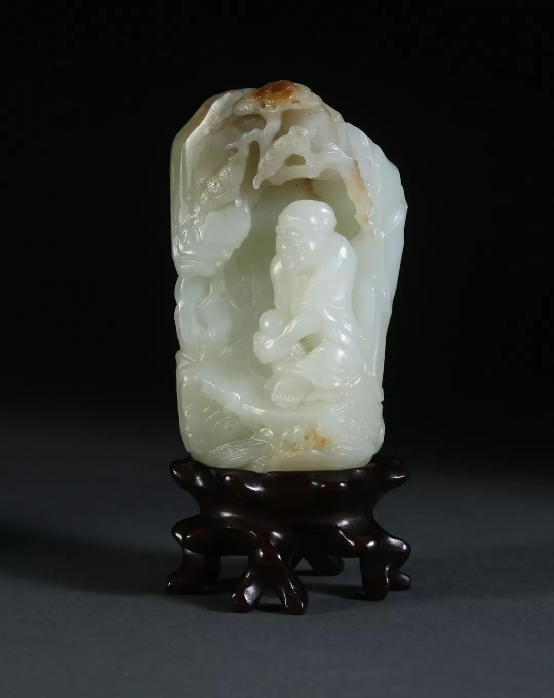 该山子用整块玉料雕琢而成,玉质细腻,白晰润透,雕工细腻精致,山子顶部褐玉随型雕刻山峦松柏,松柏之下坐一高僧,抱膝而坐,表情静谧安详。本玉山子摆件来自纽约私人收藏。类似作品参考美国纽约大都会博物馆,馆藏编号02.18.640和21.175.145。