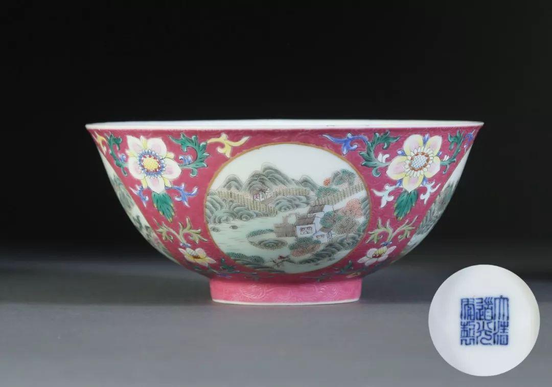 Lot 017 清道光 粉彩胭脂红地轧道开光山水图碗