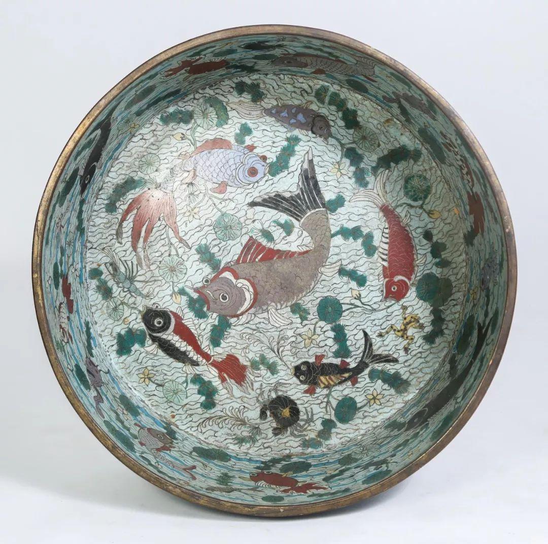 Lot 030 1900左右铜胎掐丝珐琅鱼藻莲塘图大盆