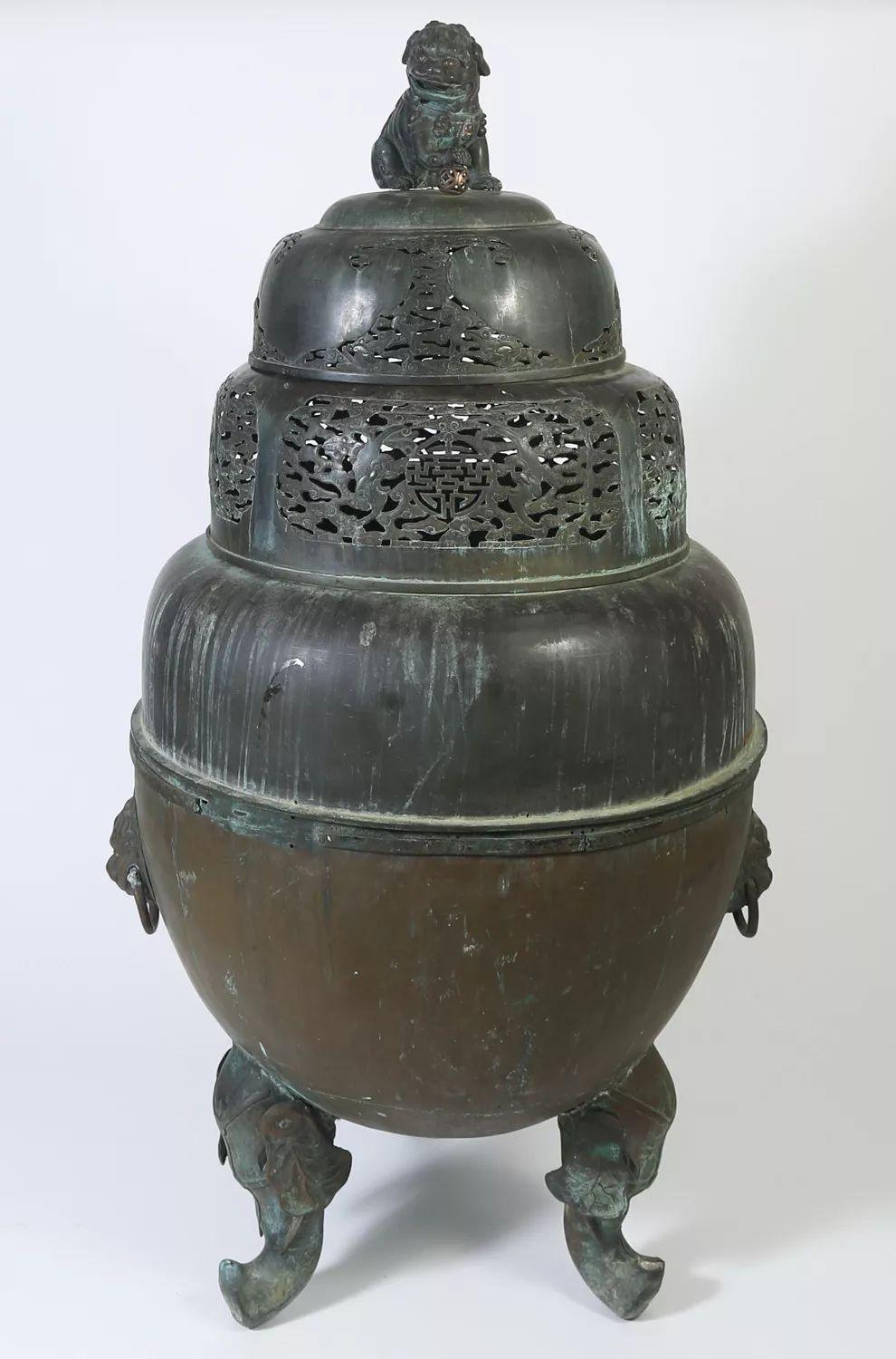 Lot 024 清错银丝狮钮象足大型铜香炉