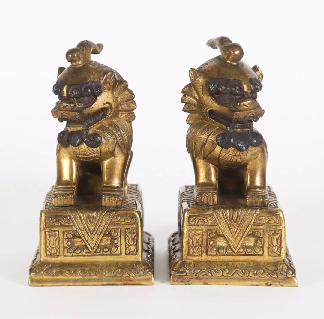 Lot 023 清一对鎏金铜狮乾隆款