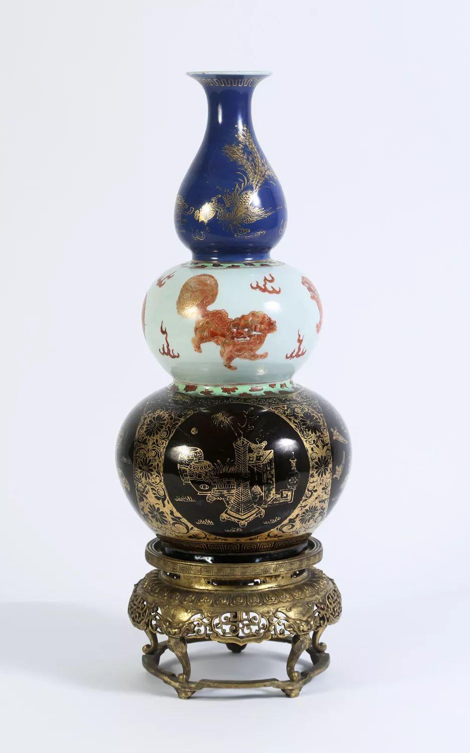 Lot 013 清三层葫芦瓷瓶配铜鎏金底座