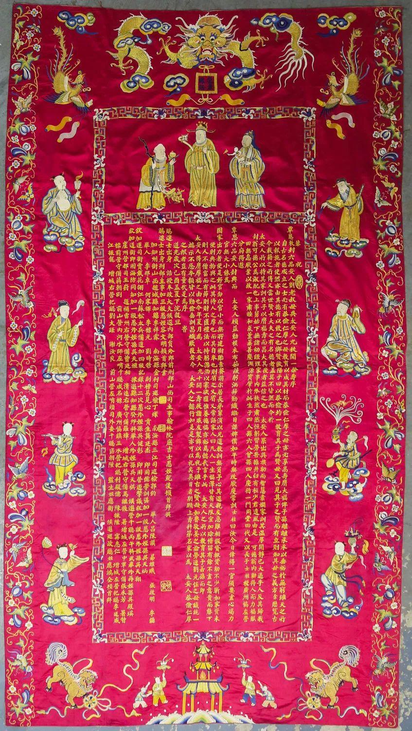 寿幛是作为宫廷给有名望的官员祝寿只用,该巨幅寿幛上的文字表明,它是一位六品官之母的81岁的寿礼,于道光己酉年(1849)。其面料为枣红色缎子,文字和图形由七彩丝线手工刺绣而成。顶部有龙凤纹,并绣有“龙章凤诰”四字印。