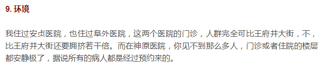 “我住过安贞医院,也住过阜外医院,这两个医院的门诊,人群完全可比王府井大街,不,比王府井大街还要拥挤若干倍。而在神原医院,你见不到那么多人,门诊或者住院的楼层都安静极了,据说所有的病人都是经过预约来的。”