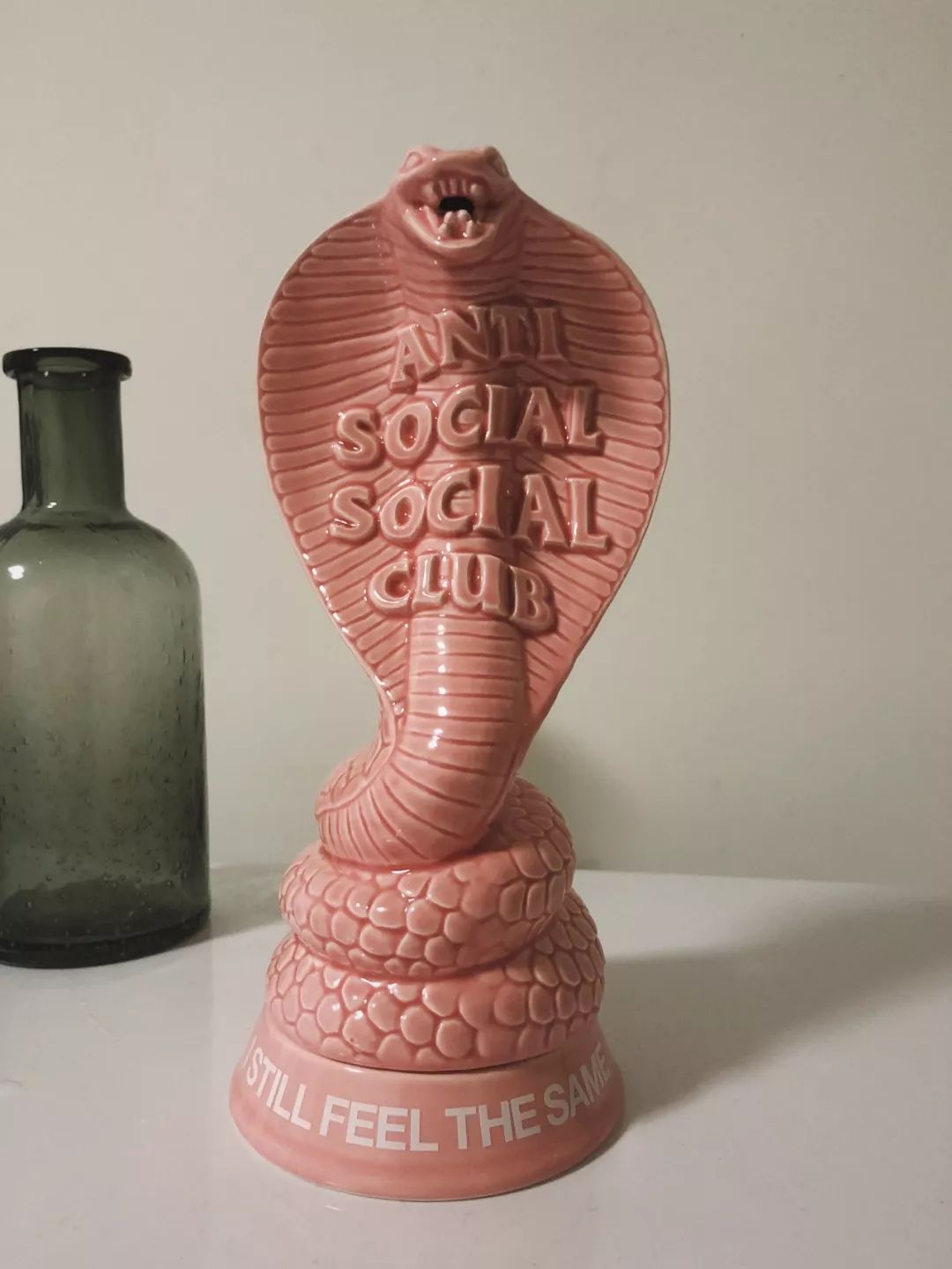 设计上,该条眼镜蛇前后方分别有「Anti Social Social Club」和「NBHD GET WEIRD」的字样浮雕,底盘则写有「STILL FEEL THE SAME」,看到实物还是挺满意的。不过唯一的缺点可能是觉得这座香座体积太小了,不够大气吧。如果,你问值不值得买?看下 NEIGHBORHOOD x FUCT SSDD 七头蛇香座现在的市场价格就知道了...(当然,肯定不会涨到七头蛇香座那么高)