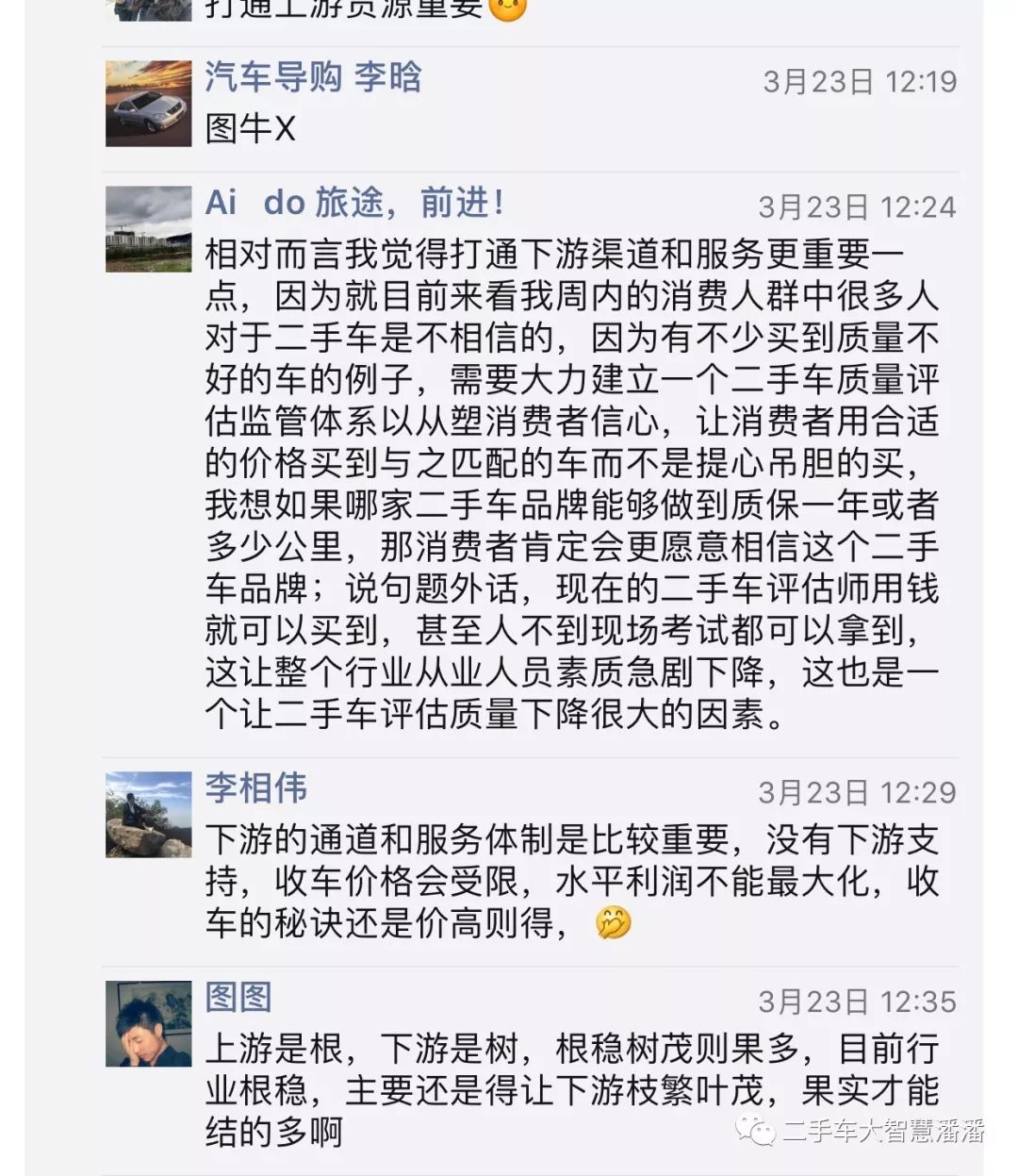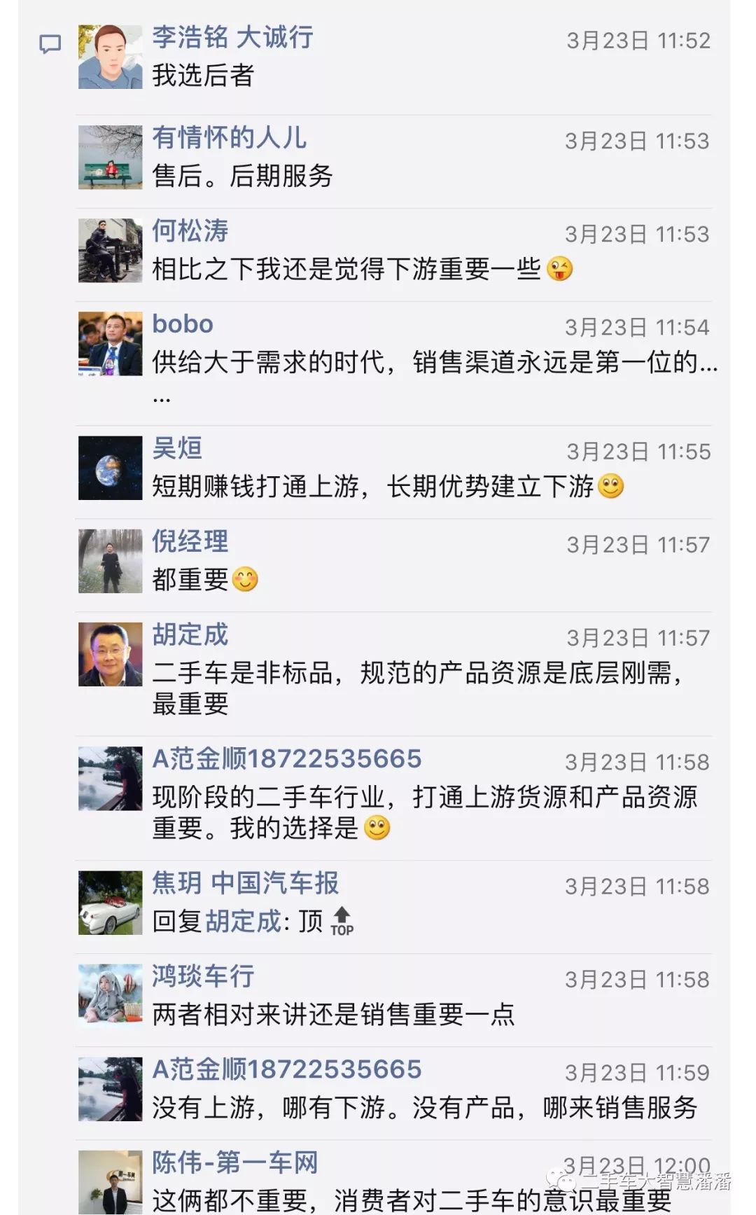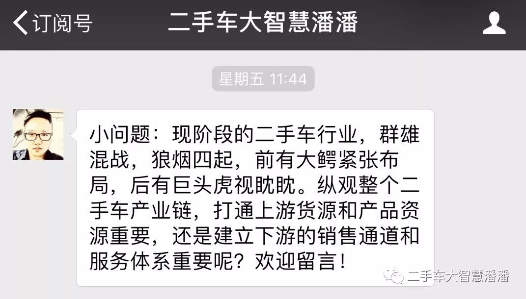 “现阶段的二手车行业,群雄混战,狼烟四起,前有大鳄紧张布局,后有巨头虎视眈眈。纵观整个二手车产业链,打通上游货源和产品资源重要,还是建立下游的销售通道和服务体系重要呢?”