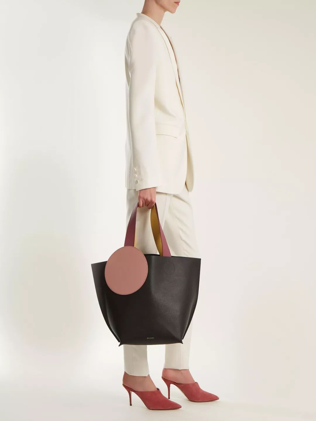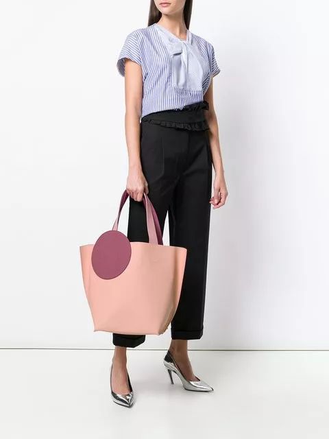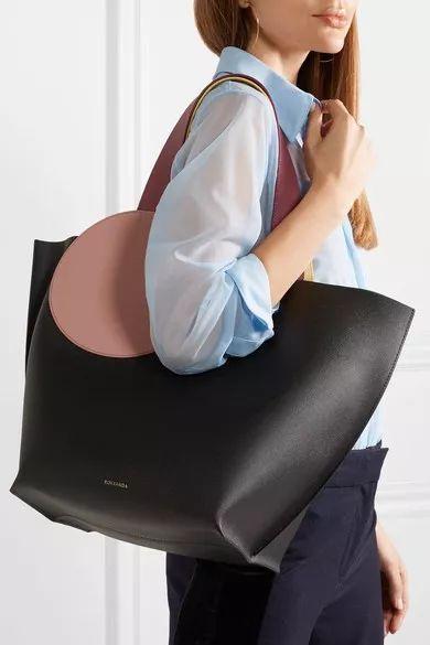 一个简单的圆形,就能解救乏味的基本款 Tote Bag,提手被巧妙地设计成了和圆形贴片一样的颜色,低调中也能看出设计的巧思。