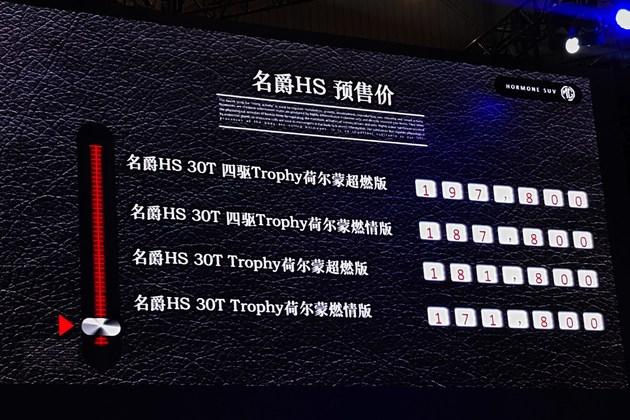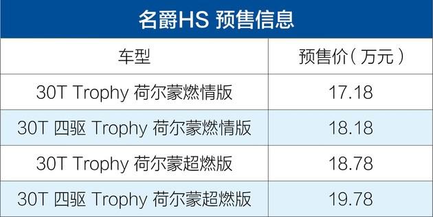 易车成都报道2018年8月31日,名爵官方宣布HS 30T车型的预售价17.18-19.78万元,共将推出4款车型。新车主打年轻运动,配备30T Trophy高性能版涡轮增压发动机、AWD智能四驱系统、MG PILOT智能主动驾驶辅助系统、最新互联网汽车智能系统等。