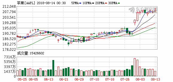 另一方面,苹果盘中股价再创历史新高,触及210.95美元。股价在最近一波飙升后,市场上仍有不少投资者认为,万亿市值可能只是苹果的起点,其未来成长空间值得期待。