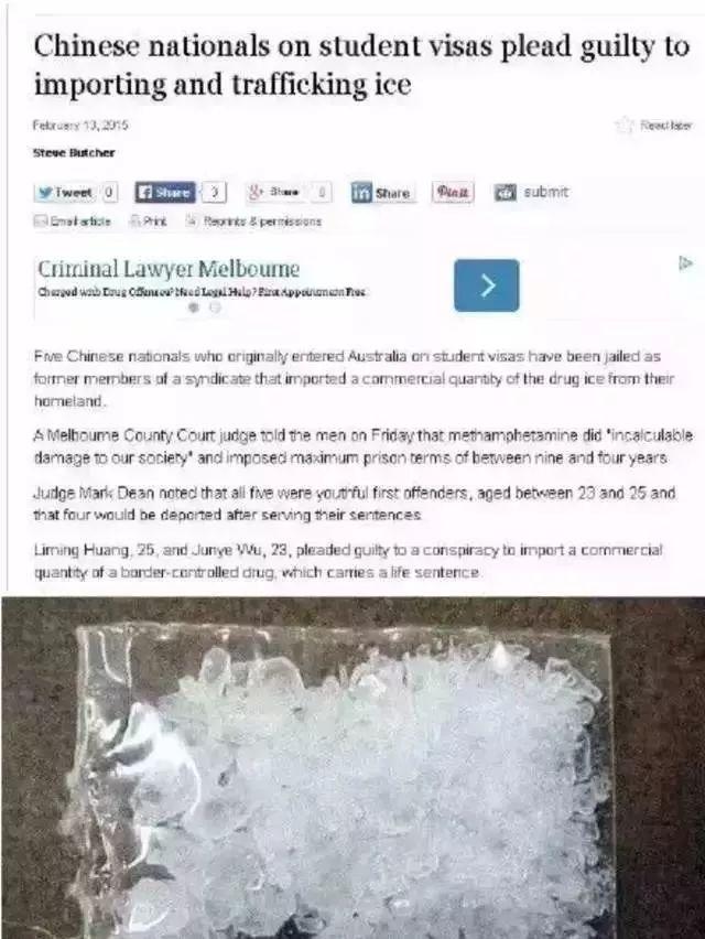 5名中国留学生在从中国回到澳大利亚时,被查出行李中有大量*毒冰**,疑与贩毒团伙有关。于是直接被判4至9年有期徒刑,不得保释。服刑结束后直接遣返回中国。