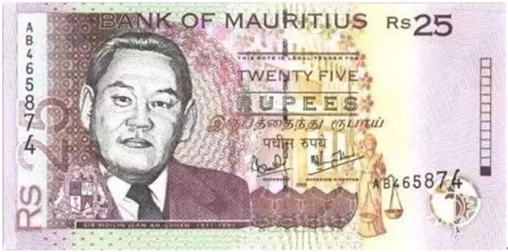 非洲国家毛里求斯,目前流通发行的25卢比(约4.4元人民币)纸币上,正面印着的是已故华人朱梅麟头像。