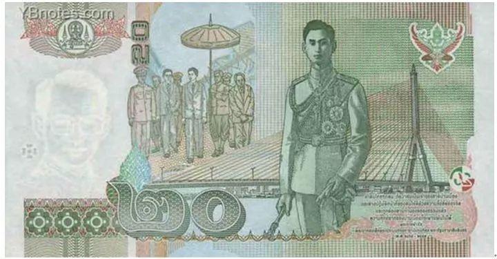 2003年3月,泰国新发行的20泰铢,背面图片是泰国拉玛八世国王阿南塔·玛希敦(1925-1946) 和拉玛八世大桥,这座大桥的主桥也是中国造。