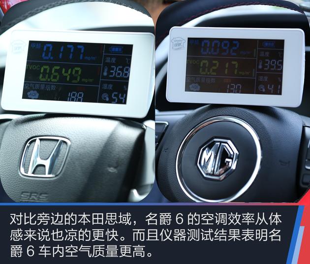 从今天短暂的体验来看,即便在正午时分进入车内,车内也没有任何气味,而且空调效力的确很高,能在很短的时间内让温度降下来。对比旁边的思域和昂克赛拉,名爵6的空调不仅在操作上更加方便,直观的体感来说也凉的更快。