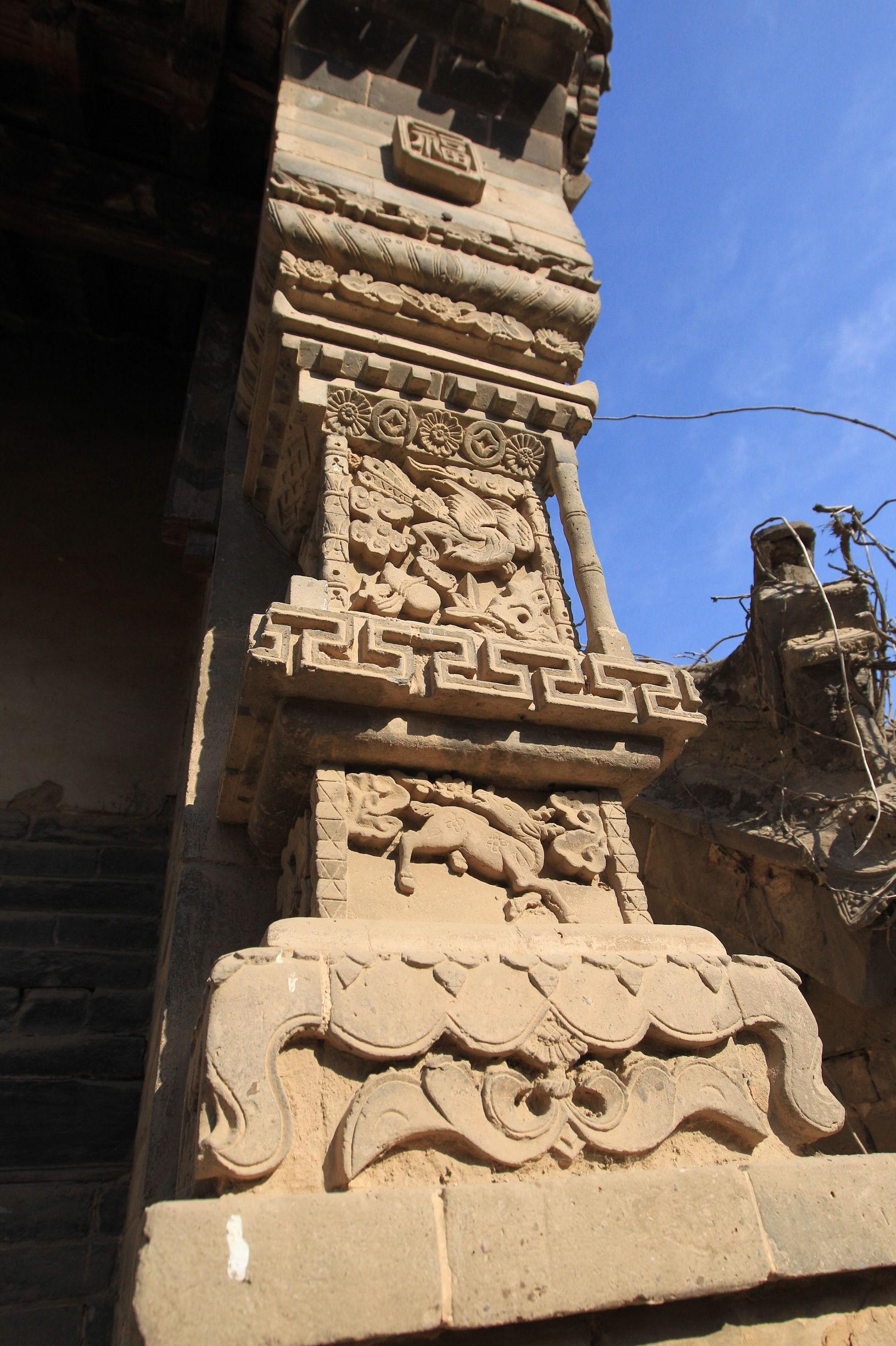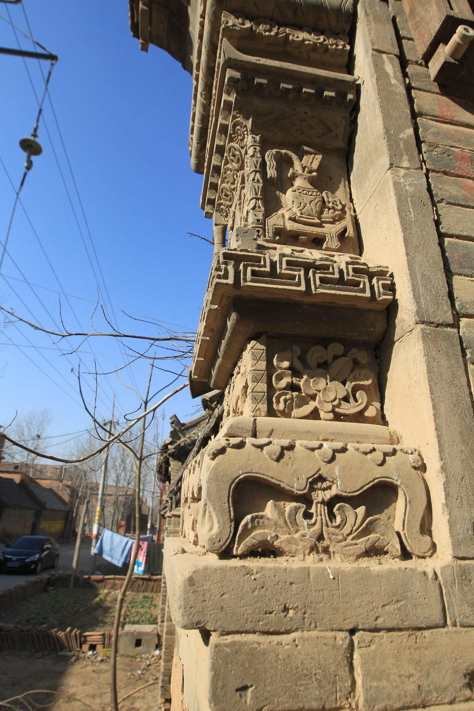 这三处并排坐落,如列兵一般的门楼,六个墀头(chí,古代传统建筑构建之一,山墙伸出至檐柱之外的部分,突出在两边山墙边檐,用以支撑前后出檐)全部遭到破坏,地上还散落着一些碎砖瓦块。之前那麒麟、凤凰、花卉、鹿、福寿字刻等精美的砖雕,以及两个门楼外边屋檐下的精美花卉、花纹木雕,甚至中间门楼的木门包括门框,均已不见。