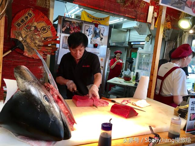 现场卸开的金枪鱼,金枪鱼大腹(o-toro)是脂肪含量最高的部位,做成生鱼片、寿司和丼饭,入口肥美丰润,肉感横流。也可以选择价格相对便宜的非腹部位置,同样有惊喜。