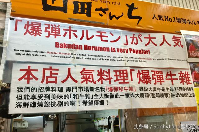 爆弹牛杂,大阪唯一的摊档,年纪不小的老板娘风韵犹存,中文广告也是打得劲爆。作为一个广东人,自然要和我们的萝卜牛杂比较一下,肉质鲜嫩,但不是很习惯它的汤头,还是家乡的老卤汁更别具风味。
