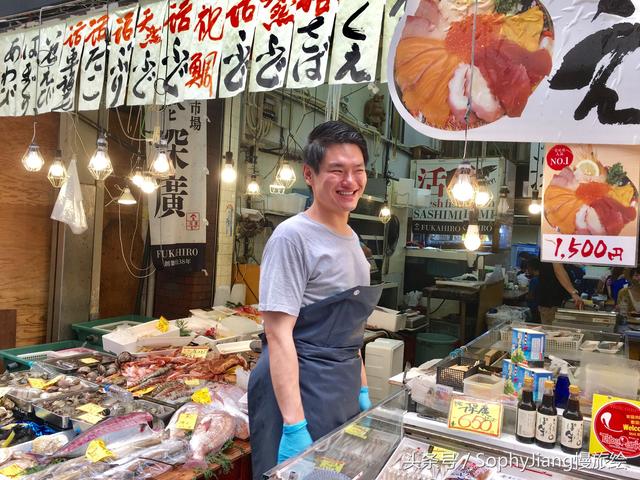 海鲜是黑门市场的重头戏,几乎一半以上的店铺都是刺身店,传说中的河豚、肥美的金枪鱼、海水味的长脚蟹、北海道甘甜的海胆、腥鲜的生蚝、现烤的扇贝和红色小章鱼......丰富多彩的海味,现买现做,“斩立决”的现场加工令人眼花缭乱。看到中国游客,买海鲜的小哥笑得真灿烂。