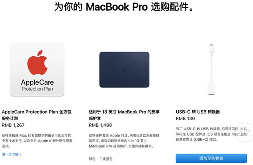 选好赠品,苹果还会提醒你是否要购买 Apple Care 或是皮革保护套等配件。Apple Care 同样享受教育优惠价,为原价的 8 折,如果还没考虑清楚,可以直接跳过,在 Mac 一年保修期内随时可购买,但就只能去线下购买了。对于 Mac 这类使用期限较长、损坏率较高的产品,我个人是建议买一份 Apple Care 有备无患。