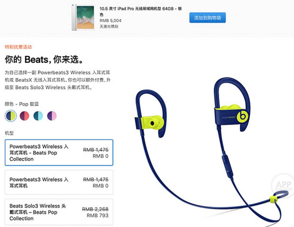 - 购买 iPad Pro,可选择 Powerbeats3 Wireless 入耳式耳机或 BestsX 入耳式耳机,也可以 793 的折扣价购买 Beats Solo3 Wireless 头戴式耳机。