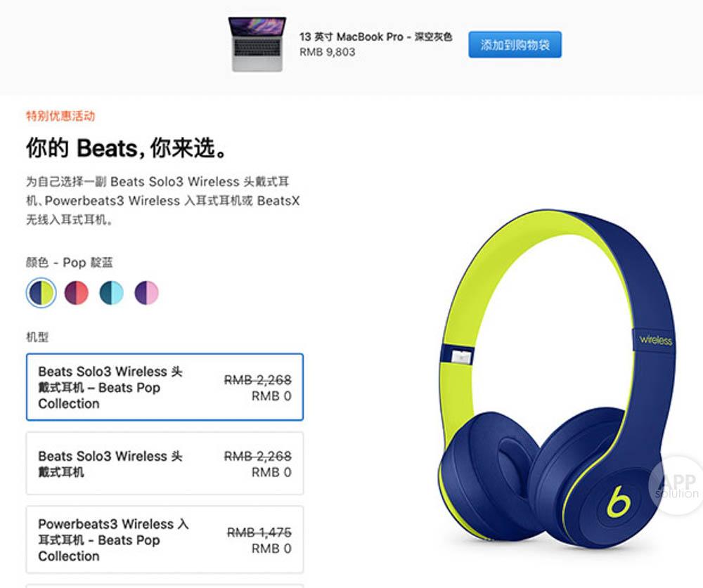 选好 Mac 或 iPad Pro 后,会比平时多了一个步骤,那就是选择 Beats 的颜色和型号。Mac 和 iPad Pro 对应的赠品有所不同: