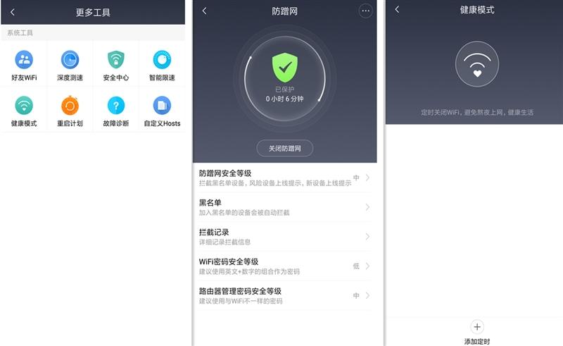 除了一些控制网络功能外,APP里还能进行好友Wi-Fi、安全中心、防蹭网、健康模式等贴心小功能,因为篇幅过长,这里不再一一叙述。