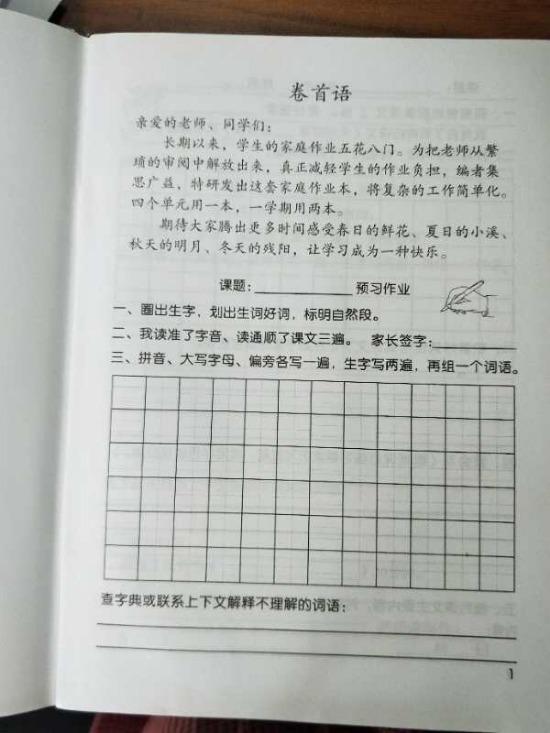 记者看到,该家庭作业本根据学生正在使用的鄂教版语文教材设计,有听、说、读、写四方面内容,而且机械抄写内容不多。除此之外,设置了听写词语的位置,和抄写词语分开,安排在不同的两面完成,抄两遍,听写一遍,作业位置全部固定下来。