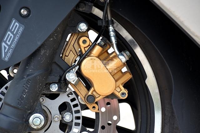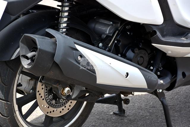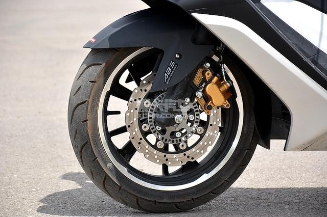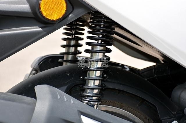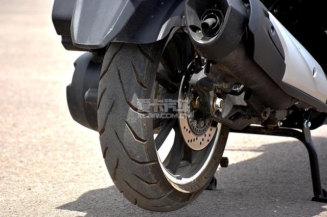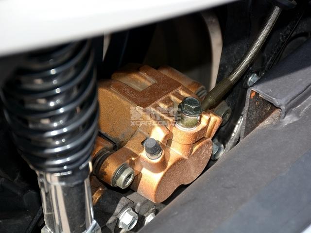 虽然前刹车为单向双活塞卡钳,但它的制动力对于一台整备质量187kg的踏板车来说已经足够用,而且RT3睿途的车辆重心比较平均,所以后刹车同样能保证充足的制动力。