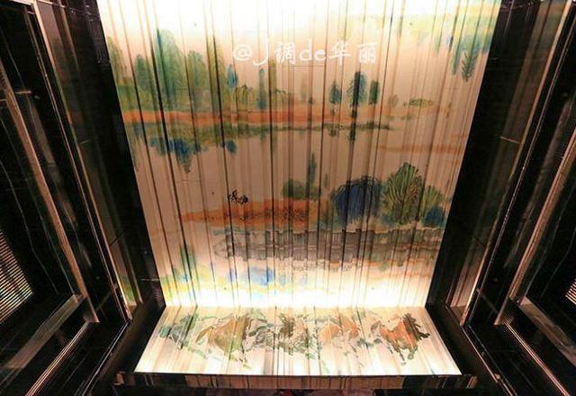 酒店大堂在103层,头顶上方是著名画家何远鸣三幅《驰骋》《晨风》《八骏》抽象中国水彩画巨作,寓意为“天马行空”,作品展现其独特艺术个性和多元表现手法,典雅中透着奢华之气。
