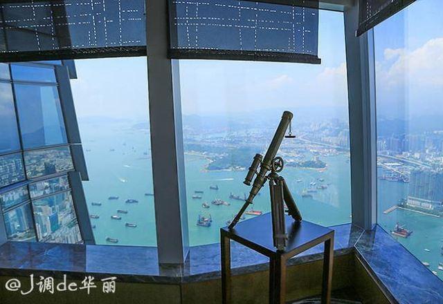 酒店的行政酒廊位于116层,柔和的灯光和古典的书架营造出舒适的氛围。每个角落都配备了复古望远镜,维港海景一览无遗。