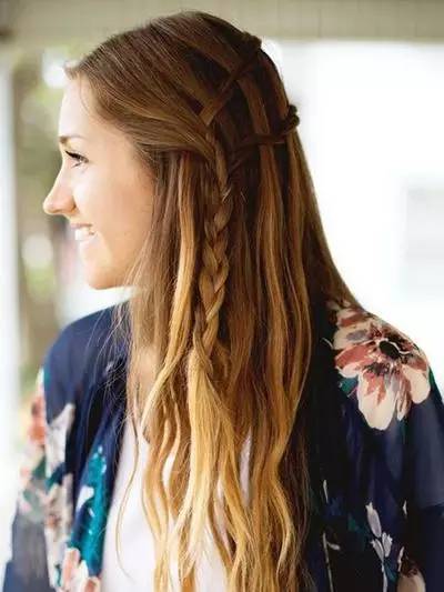 5.然后一直延伸到鬓角处,将两条辫子汇合成一条,编成3股麻花辫或者4股、5股麻花辫,根据自己喜好确定。