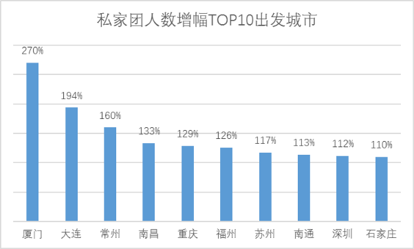 根据携程跟团游数据,在2018年暑期出行中,参与私家团的人数增长超过105%,已经占到跟团游总人数的10%,十个跟团游客里面就有一个参加。其中私家团参团人数增长最快的城市前十分别是厦门、大连、常州、南昌、重庆、福州、苏州、南通、深圳和石家庄。
