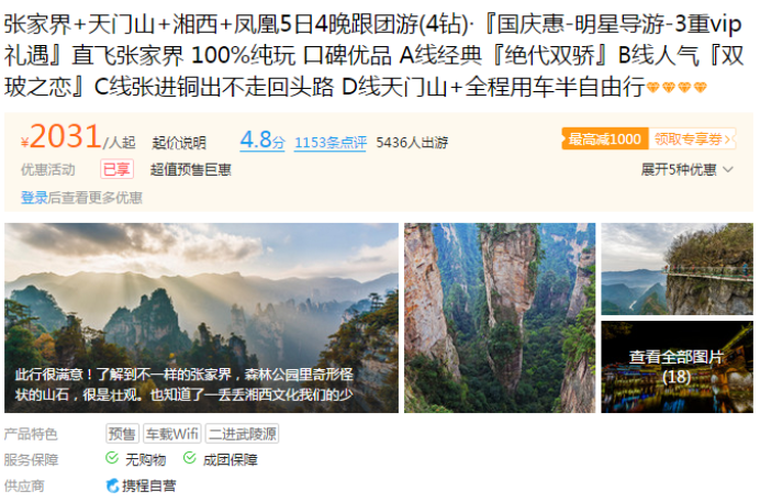 以暑期国内热门目的地张家界来看,如果从上海出发,价格会在什么范围呢?从携程旅游平台上能够发现,三钻跟团游的价格分布在1800-2500元,四钻跟团游在2000-2800元,五钻跟团游在2500-3300元。其中一条四钻产品有5436人选择,价格标注为2031元,评分达到了4.8分(满分5分)。
