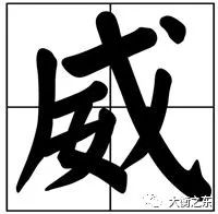 这是“威振天下”的“威”字。是个会意兼形声的字。①是金文的形体,右边是一把类似长柄大斧的*器武**,左下角是一个女人,即表示“施威”之意。“戊”也表声。②是小篆的形体。③为楷书的写法。