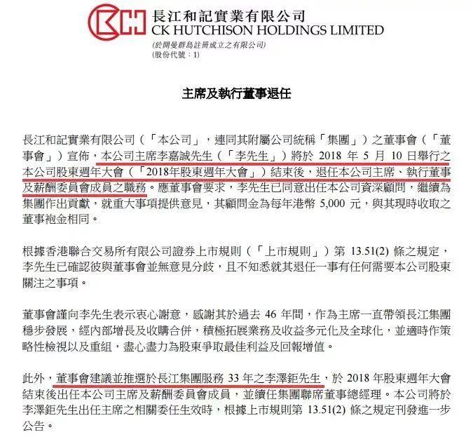 长和发布的公告显示,公司主席李嘉诚于5月10日股东大会后退任主席、执行董事及薪酬委员会成员的职务,李嘉诚已同意出任公司资深顾问,其顾问金为每年5000港元,与其现时收取的董事袍金相同。