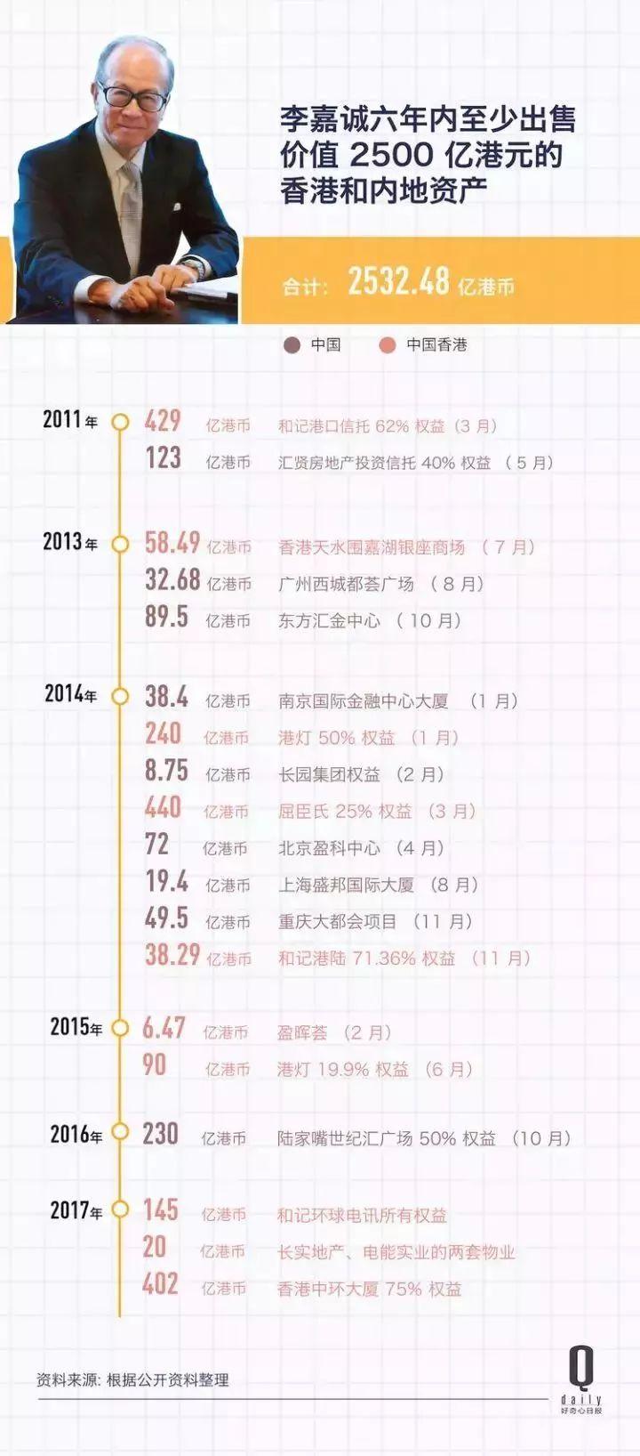 从2011年开始,李嘉诚在香港及内地开启了“卖卖卖”模式。据公开资料统计数据显示,李超人至少卖了2500亿港元的香港和内地财富。