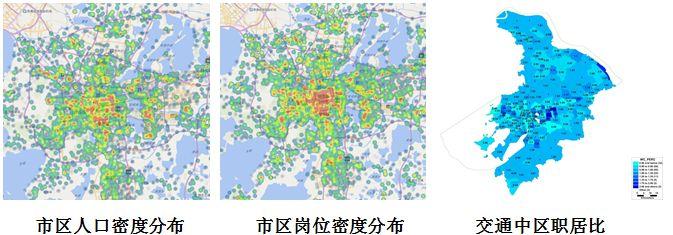 以一段较长时期的人*活口**动情况训练识别夜间居住地和白天工作地,运用加权平均区域中心点的办法解决乒乓切换的问题。苏州市区范围的夜间居住人口、白天就业人口的空间分布及职住平衡如下图所示。