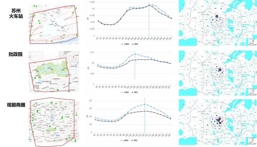选取苏州观前商圈、拙政园景区、苏州火车站等热门区域,了解客流范围特征。