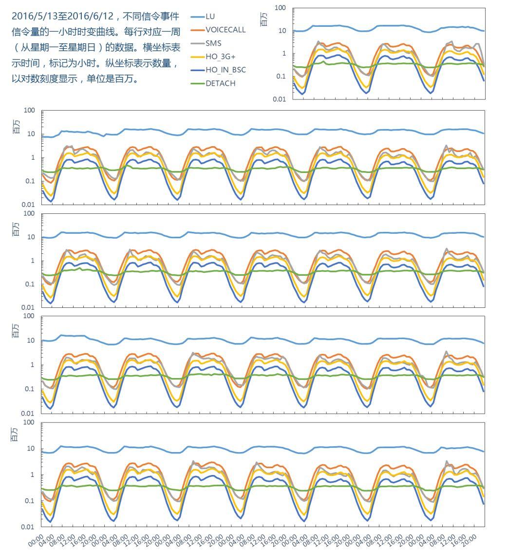 下图为不同信令事件有效信令量的以一小时为间隔的时变曲线,纵坐标对应的数值表示每小时不同事件的有效信令量。在信令事件中位置更新信令占75%左右,白天(7:00-21:00)位置更新的信令量基本稳定,不存在双峰结构,夜间绝大部分的信令来自位置更新。语音呼叫(VOICECALL)有两个峰,分别发生在上午和下午;切换和语音呼叫紧密相关,所以也有两个峰,对应上午和下午时间段;短信(SMS)一般有三个峰,分别对应上午、下午和晚上;IMSI分离的曲线在白天和夜间都较平稳,夜间相对于白天少30%左右。