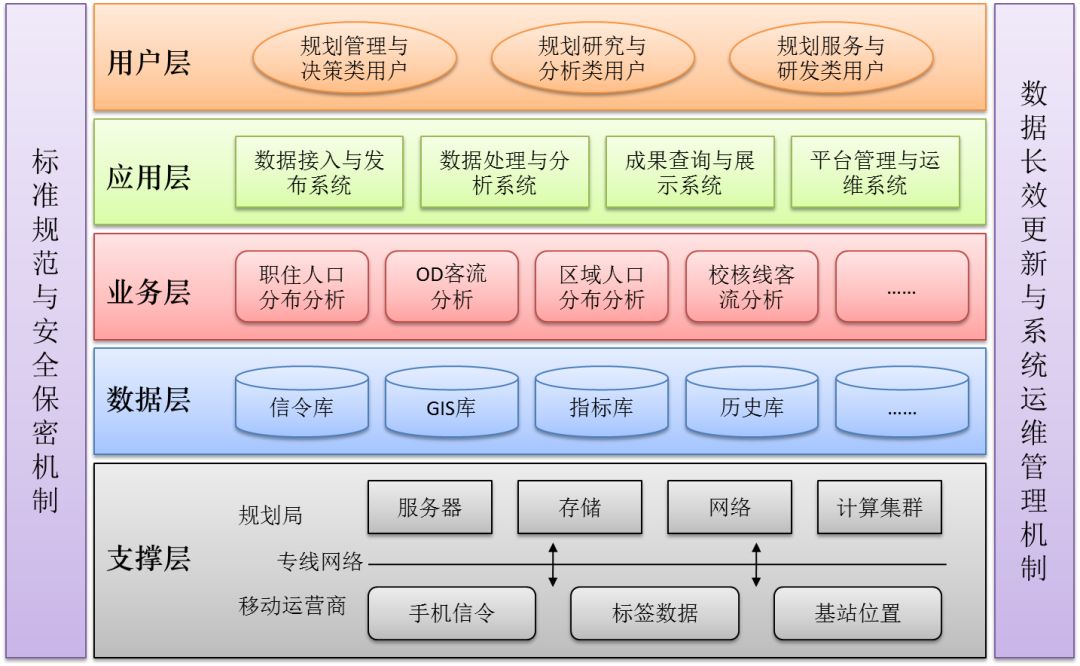 2)数据层主要是实现平台所有手机信令数据、基础空间数据、中间成果数据、业务专题数据、规划指标数据的组织与建库。