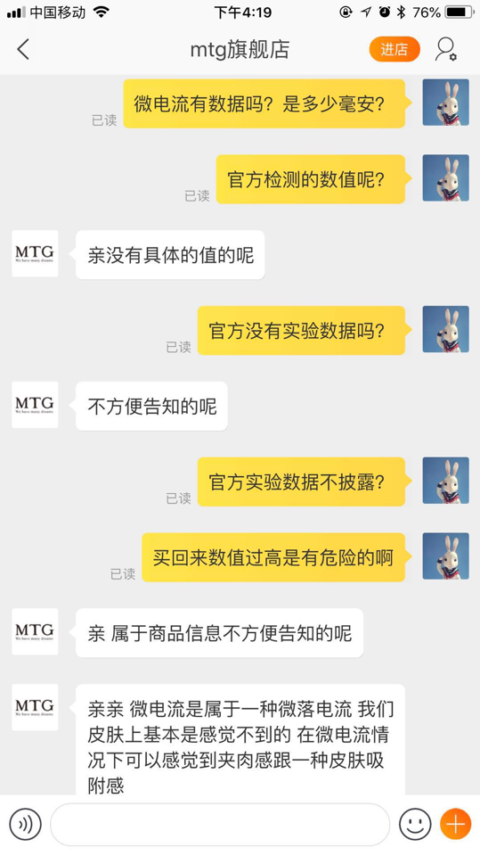 没有查到任何相关数据,也没有任何官方的实验数据可以参考。这点确实出乎意料,于是我去问了问 MTG 天猫官方旗舰店的客服: