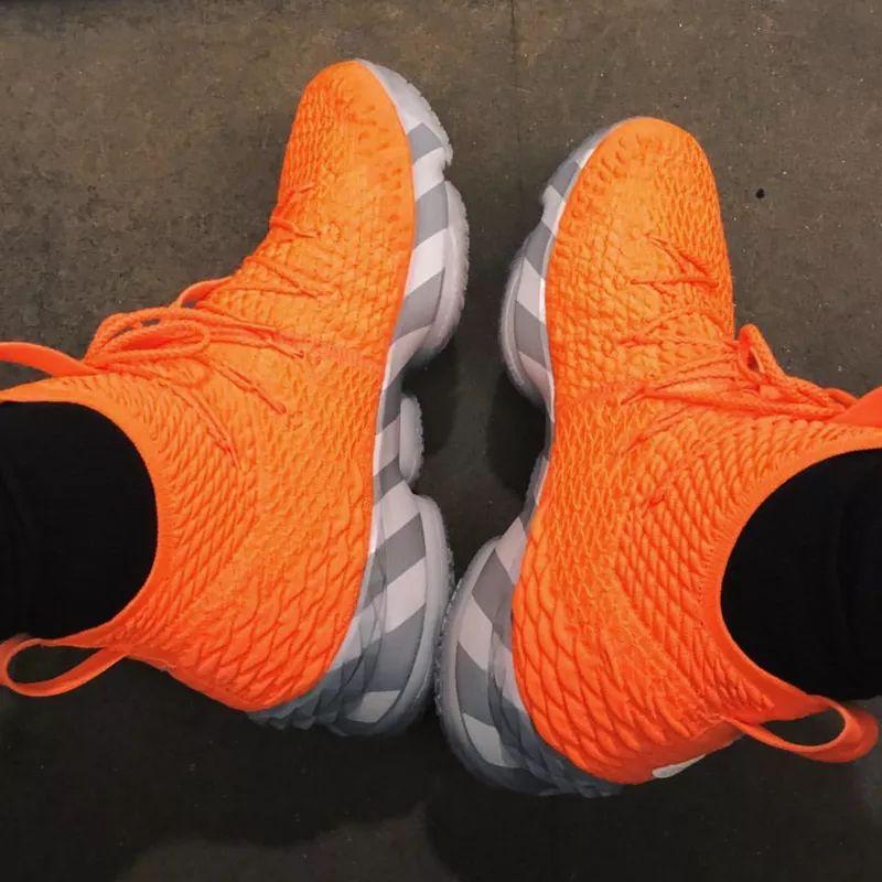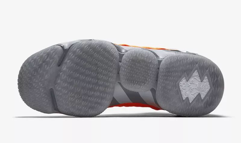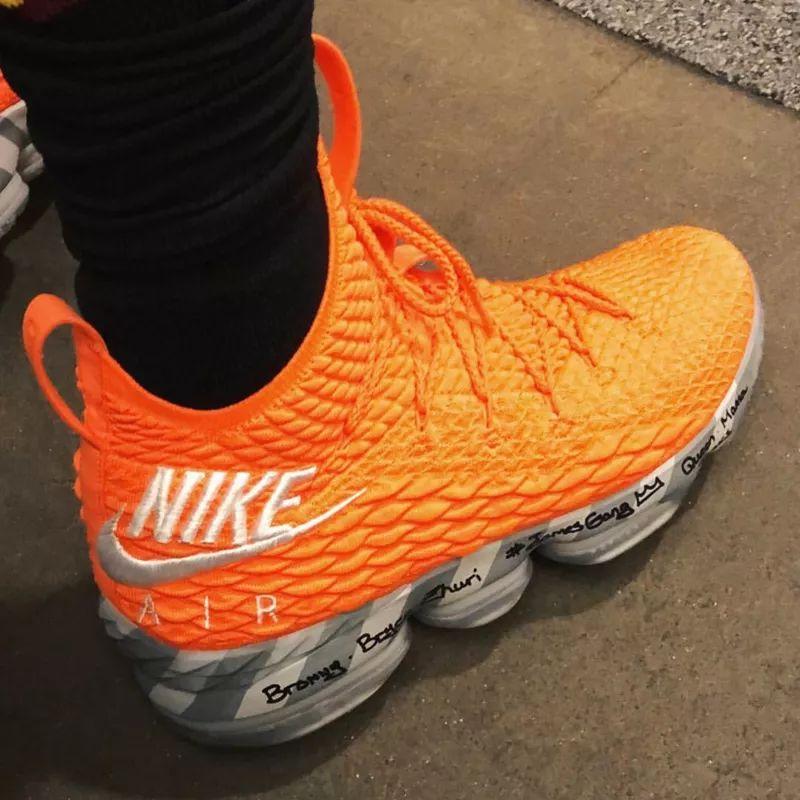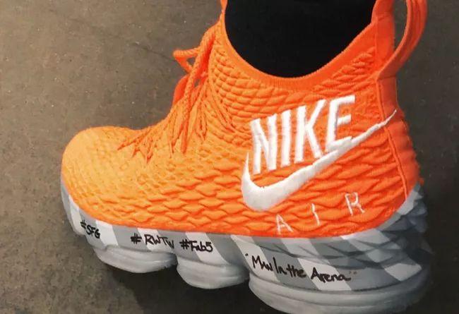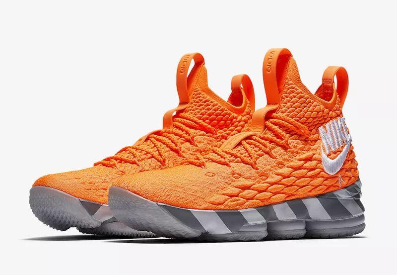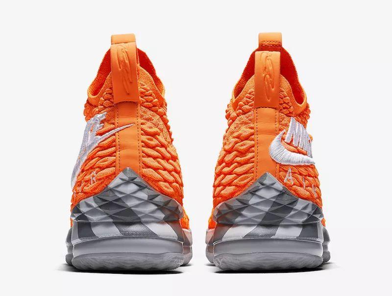 LeBron 15 “Orange Box” 灵感来自于 Nike 最初版的橙色鞋盒,以橙色编织鞋面搭配深浅灰交替的条纹中底,后跟外侧绣有经典的 Nike Air Logo。从詹皇上脚照看配色极为亮眼,刺绣 Logo 质感不俗,是 LeBron 15 极具个性的一款配色。