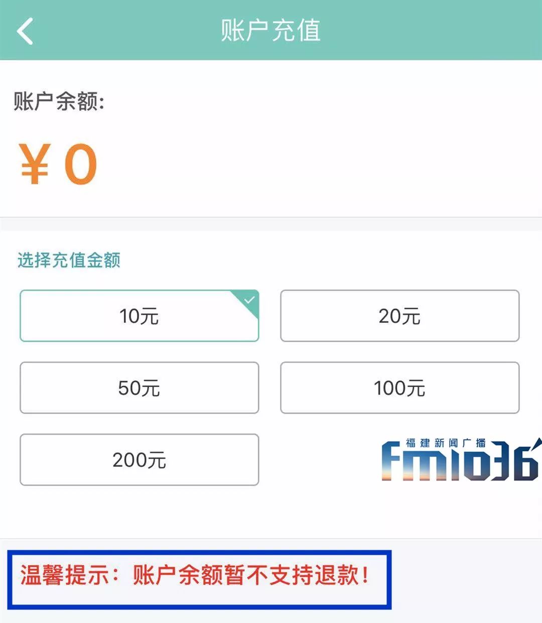 福建新闻广播“1036三剑客”在榕城通乘车码业务办理协议中第五条注意到这样的内容,“您知悉对于未使用的金额不可进行退款、转移或转赠。”在充值页面下方,也清晰写明不支持退款!