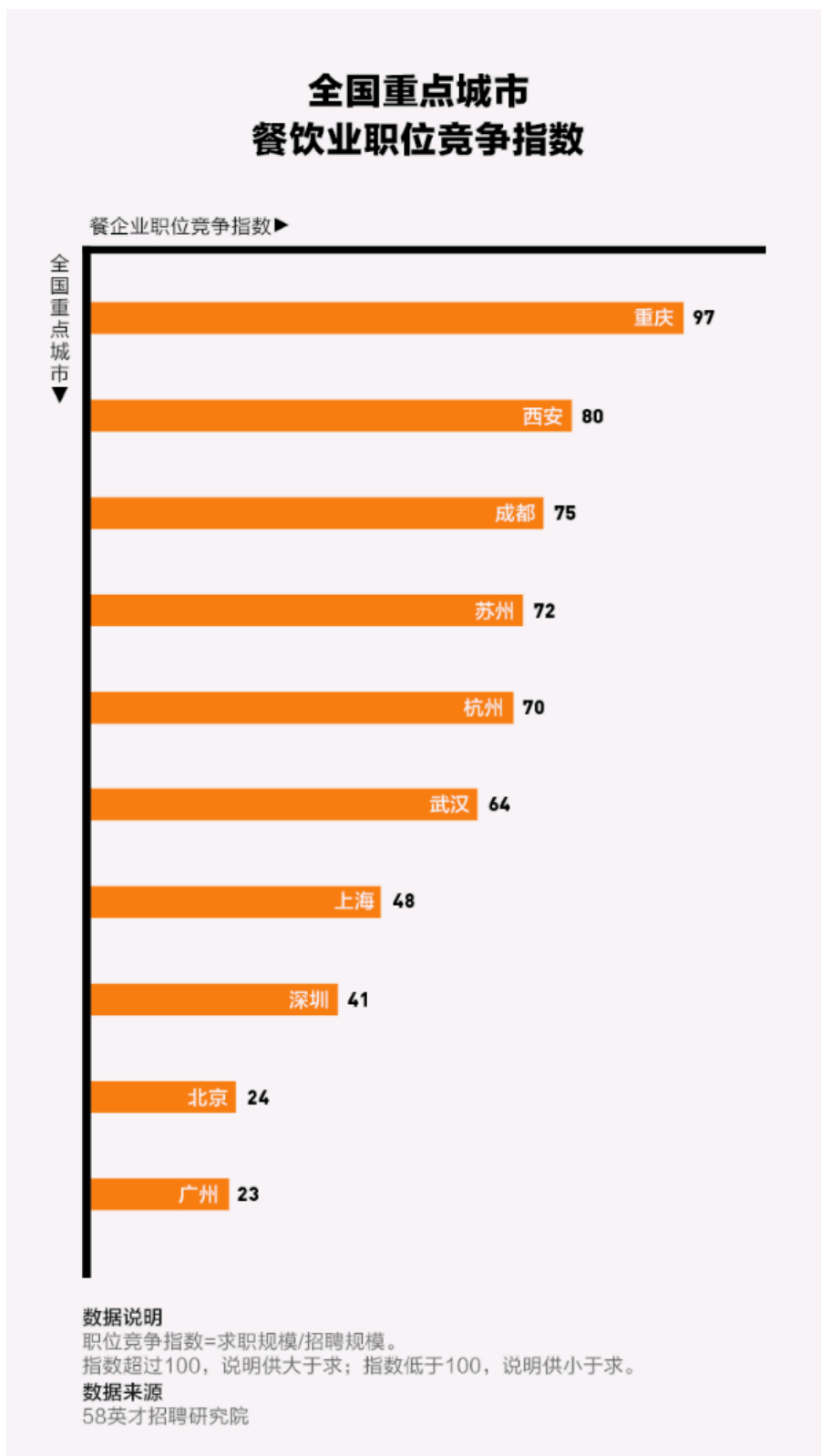 日前,阿里巴巴旗下本地生活服务平台口碑联合国内最大的生活服务平台58同城旗下的58英才招聘研究院,发《2018年1至4月全国重点城市餐饮业用工分析报告》。报告显示,北上广深、武汉等一二线城市餐饮用工缺口巨大,餐饮人员供不应求的现象显著。在餐饮企业招聘量城市前十位中排名中,广州排第二位,仅次于北京。从餐饮业职位竞争指数来看,广州供不应求的缺口较大。