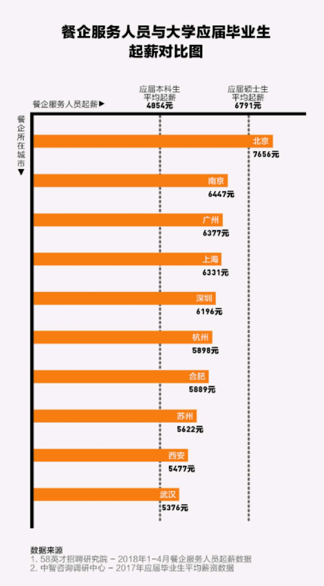 对比中智咨询调研中心去年9月发布的《2017届全国应届毕业生起工资平调查报告》可发现,该薪资水平已普遍高于2017应届本科毕业生的平均起薪。而在北京,北京餐饮企业支付薪资水平甚至高出2017应届硕士毕业生的平均起薪近千元。广州的6377元平均薪资,也高出2017应届本科毕业生的平均起薪1500元左右。