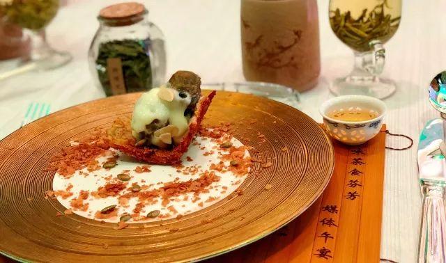 将山海的美味贯穿起来的,是宴会上未曾断绝的茶香。除了在菜品中加入新茶的芬芳,配餐的茶饮亦精选各地名茶。冷盘搭配明前龙井,以清新之气开启一餐的好胃口;用茉莉花茶解掉芥末的浓稠;以桂花红茶烘托鳕鱼鲜味……武夷山大红袍、生普、珍藏1998年份熟普,一场午宴下来,茶香绕梁,茶醉及顶。悠然间恍惚盘中有座青翠茶岭,绵延不绝,直抵心间。所谓“声疑松带雨,饽恐生烟翠”,大概便指这样的幻视罢?