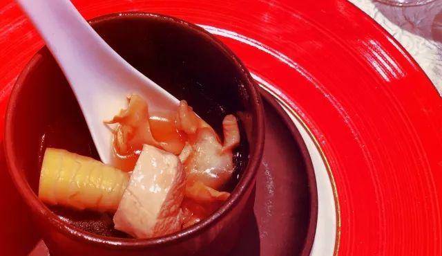 晚宴另一个主角,是来自蒲江明月村的雷笋。除了春笋的冷盘与川式春笋焖牛腩,成都站“寻味茶时芬芳”的晚宴菜单许多菜肴还加入了明月村雷笋。因此,我们品尝到的鱼香肉丝多出三分笋的脆嫩;以雷笋清炖的土鸡汤,汤汁中能够品出茶香与竹香融合出的绝妙滋味。大熊猫钟爱的笋,在成都香格里拉大酒店李托芬师傅手下,焕发出全新面目。