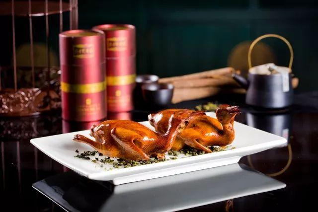 产自福建安溪的铁观音,是中国乌龙茶的代名词,用其制成卤汁。乳鸽过水后,放入酒、葱、姜中泡制、去腥,再浸入卤汁中,经过4小时,茶香渗入乳鸽的每一个细胞内。再用古法烟熏。乳鸽肉质细腻,鲜美多汁,带着淡淡的茶香。因鸽子性温补,与具有祛寒功效的铁观音互补平衡,实为茶膳佳作。