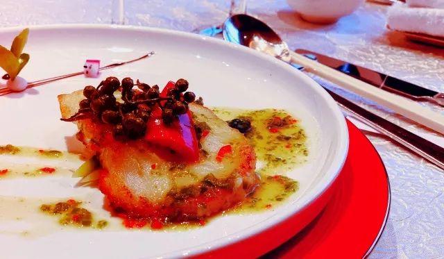 以茶入菜是品味春日新茶的形式。尤为中意这道春茶香煎鳕鱼,青花椒的麻并没有掩盖住鳕鱼的鲜嫩与春茶的微苦,极富层次的口感延长了鱼肉入口后咀嚼与回味的时间。味觉搭配与火候的掌控,让这道菜值得细细去品鉴。