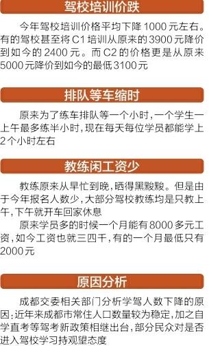 近日,记者走访成都市中心附近的多家驾校发现,今年的驾校培训价格和往年相比,平均下降1000元左右。有的驾校甚至将C1培训从原来的3900元降价到如今的2400元。而C2的价格更是从原来5000元降价到如今的最低3100元。